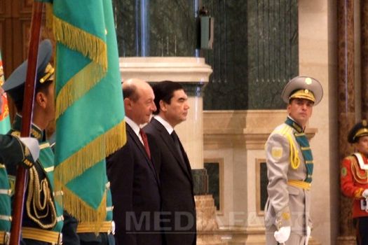 Preşedintele Băsescu a primit salutul a circa 100 de soldaţi de gardă turkmeni, ceremonialul continuând cu intonarea imnurilor celor două state. De asemenea, preşedintele Băsescu i-a salutat pe membrii Guvernului de la Ashgabat, liderului turkmen fiindu-i prezentaţi membrii delegaţiei oficiale a României.