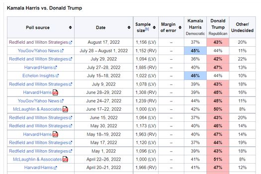 Însă după sondajele realizate între 12 mai 2021 şi 17 august 2022, Kamala nu are şanse să-l învingă pe Trump.