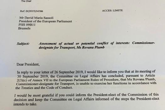 „Ca răspuns la scrisoarea dumneavoastră din 26 septembrie 2019, aş dori să vă informez că la întâlnirea din 30 septembrie 2019, Comisia pentru Afaceri Juridice a conchis, potrivit articolului 2 (3) (c) din Anexa VII a Regulilor de procedură ale Parlamentului European, că doamna Rovana Plumb, comisar european desemnat pentru Transporturi, nu este în măsură să îşi exercite atribuţiile în conformitate cu Tratatul şi Codul de Conduită”, a precizat Lucy Nethsingha, în scrisoarea trimisă preşedintelui PE, obţinută de MEDIAFAX.