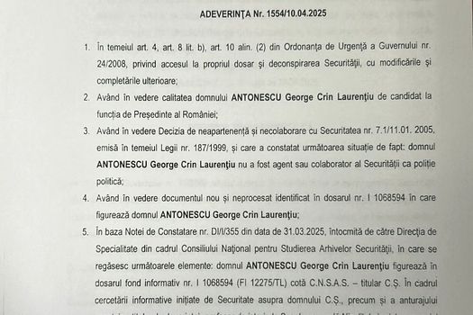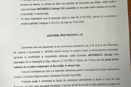Documentul, înregistrat cu numărul 1554/10.04.2025, a fost emis în conformitate cu dispozițiile Ordonanței de Urgență a Guvernului nr. 24/2008, privind accesul la propriul dosar și deconspirarea Securității, și a fost semnat de președintele CNSAS, Constantin Buchet.