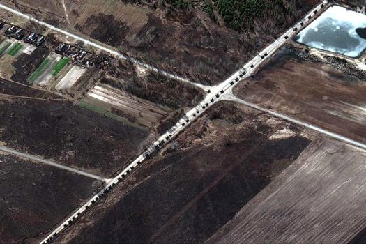 Imaginile din satelit realizate de compania Maxar prezintă un convoi militar rusesc la nord de Kiev, care se întinde pe aproximativ 64 km. Convoiul este substanţial mai mare faţă de raportările iniţiale făcute în cursul zilei.