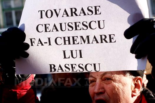 Protestatarii au fluierat şi au scandat lozinci împotriva Guvernului şi a preşedintelui Traian Băsescu, precum „Băsescu nu uita, România nu-i a ta”, „Tovarăşe Ceauşescu, fă-i chemare lui Băsescu”, „Jos dictatorul” şi „Hoţii”.
