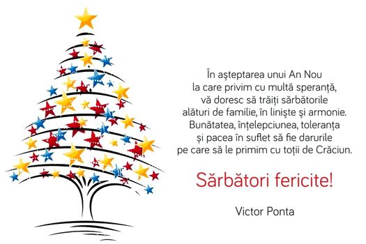 Premierul Victor Ponta a postat, marţi, pe pagina sa de Facebook o urare pentru români de Crăciun şi Anul Nou: ”În aşteptarea unui An Nou la care privim cu multă speranţă , vă doresc să trăiţi sărbătorile alături de familie, în linişte şi armonie. Bunătatea, înţelepciunea, toleranţa şi pacea în suflet să fie darurile pe care să le primim cu toţii de Crăciun. Sărbători fericite!” este mesajul postat de premier.