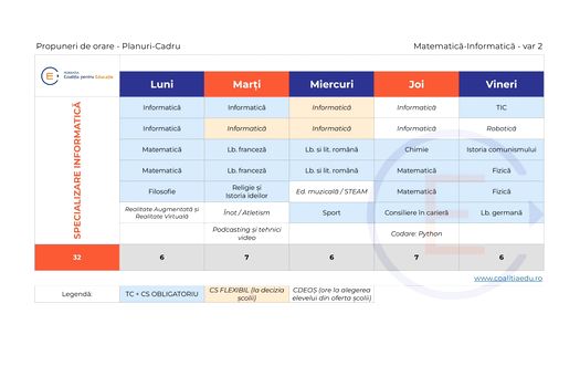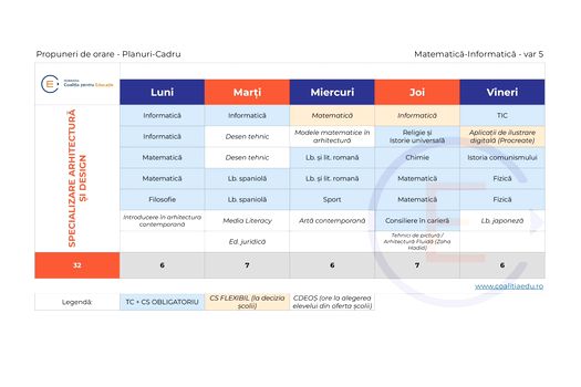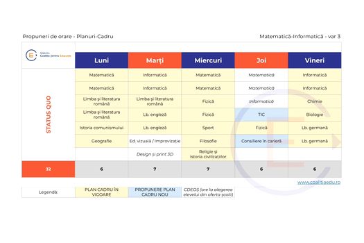 În vizualurile ataşate, găsiţi 5 variante de orar posibile pentru profilul real, specializarea Matematică-Informatică. Acestea reflectă diversitatea şi flexibilitatea pe care o aduc noile planuri-cadru, permiţând fiecărei şcoli să îşi personalizeze traseul educaţional pe care îl oferă”, au precizat cei de Coaliţia pentru Educaţie.