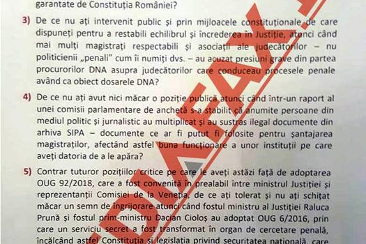 De asemenea, şeful statului este întrebat de ce nu a intervenit public atunci când unii magistraţi au acuzat public presiuni ale procurorilor DNA asupra judecătorilor.