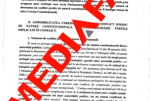 -considerăm că neaplicarea de către înalta Curte de Casaţie şi Justiţie, în privinţa completelor de 5 judecători, a legii astfel cum a fost adoptată în Parlament, împreună cu refuzul explicit de a modifica configuraţia completelor în acord cu prevederile legale, reprezintă o depăşire de către instanţa supremă a atribuţiilor sale constituţionale prin arogarea unor atribuţii care revin Parlamentului, situaţie care este de natură să creeze un conflict juridic de natură constituţională.