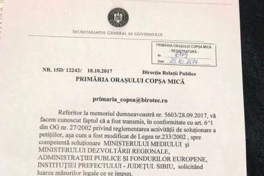Referitor la memoriul dumneavoastră nr. 5603/28.09.2017, vă facem cunoscut faptul că a fost transmis în conformitate cu art. 6.1 din OG nr. 27/2002 privind reglementarea activităţii de soluţionare a petiţiilor , aşa cum a fost modificat de Legea nr. 233/2002 spre competentă soluţionare MINISTERULUI MEDIULUI şi MINISTERULUI DEZVOLTĂRII REGIONALE, ADMINISTRAŢIEI PUBLICE ŞI FONDURILOR EUROPENE, INSTITUŢIEI PREFECTULUI / JUDEŢUL SIBIU, solicitând luarea măsurilor legale ce se impun. Urmează ca, în termenul legal, instituţiile sesizate să