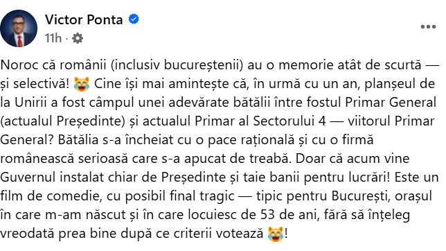 Vizavi de acest subiect, Victor Ponta a comentat ironic că românii, inclusiv bucureștenii, par să aibă o memorie scurtă și selectivă. El a amintit că, acum un an, planșeul de la Unirii a fost scena unui conflict între fostul Primar General (actual Președinte) și actualul Primar al Sectorului 4, care s-a încheiat cu o înțelegere și cu atribuirea lucrărilor unei firme românești de încredere.