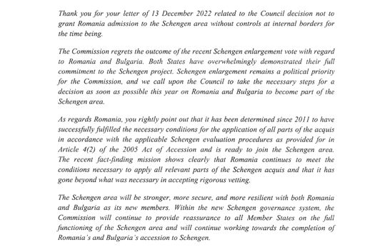 „Ursula von der Leyen: România trebuie să intre în Schengen cât mai curând posibil anul acesta. Imediat după refuzul Austriei de a vota pentru accesul României în Schengen, i-am transmis Preşedintei Comisiei Europene, Ursula von der Leyen, o scrisoare în care solicit cu fermitate sancţionarea acestui abuz de drept. În scrisoarea de răspuns pe care am primit-o astăzi (luni – n.r.), preşedinta von der Leyen îmi dă dreptate şi subliniază corectitudinea tuturor argumentelor pe care le-am invocat. Prin urmare, Ursula von der Leyen cere Consiliului să ia o decizie