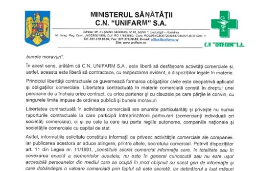 Vă aducem la cunoştinţă imposibilitatea noastră de a vă furniza informaţiile solicitate întrucât acestea nu constitutie informaţii de interes public, subscrisa fiind ţinută atât de secretul comercial, dispoziţiile în materia concurenţei loiale clauzele de confidenţialtate cât şi de reglementările în materia procedurii de urmărire penală”, tramsmite noul şef al CN Unifarm SA, Cornel Ionuţ Ionescu.