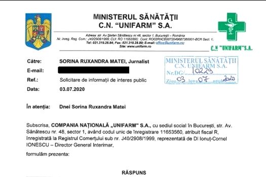Şeful interimar al Unifarm SA a fost solicitat să transmită în baza legii 544/2001 privind accesul informaţii de interes public toate contractele încheiate de instituţia pe care o conduce în perioada 1 martie 2020-30 iunie 2020, pe orice fel de echipamente de protecţie: măşti, combinezoane, ochelari de protecţie, ventilatoare, teste rapide/PCR, şi să transmită publicului cine a încheiat respectivele contracte în numele Unifarm SA, data încheierii contractelor, cantităţile cuprinse în contracte, modalitatea de achiziţie, valoarea totală a fiecărui contract şi firmele de la care s-au contractat cât şi cele care au livrat respectivele echipamente/produse de protecţie împotriva pandemiei COVID-19. Însă actualul şef al Unifarm a refuzat.