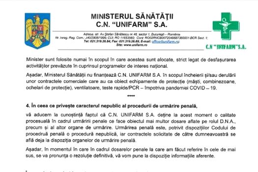 Noul şef al CN Unifarm susţine în răspunsul public că este „încurcat” şi de ancheta DNA. „În ceea ce priveşte caracterul nepublic al procedurii de urmărire penală, vă aducem la cunoştinţă faptul că CN Unifarm SA deţine în acest moment o calitate procesuală în cadrul urmăririi penale ce face obiectul mai multor dosare pe rolul DNA, precum şi al altor organe de urmărire penală. Urmărirea penală este, potrivit dispoziţiilor Codului de procedură penală, o procedură nepublică iar contractele solicitate se află deja la dispoziţia organelor de urmărire penală. Aşadar, în momentul în care în cadrul dosarelor penale la care am făcut referire în cele de mai sus, se va pronunţa o rezoluţie definitivă, vă vom pune la dispoziţie informaţiile aferente (….).