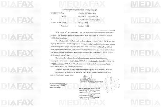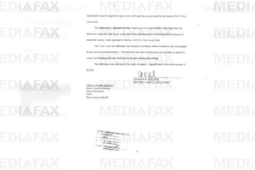 „Inculpatul este condamnat pentru conducere sub influenţă pentru că a încălcat Secţiunea 321J.2 a Codului Penal din Iowa. Inculpatul este condamnat să execute 2 zile de închisoare în Penitenciarul Story County, să i se scadă din perioada pe care a executat-o, dacă a executat, aşa cum arată evidenţa din Story County. Inculpatul trebuie să plătească o amendă de 1000 de dolari, o taxă suplimentară de 300 de dolari, o suprataxă de 5 dolari pentru Drug Abuse Resistance Education ( Educaţie pentru Rezistenţa la Abuzul de Droguri) şi costurile judiciare