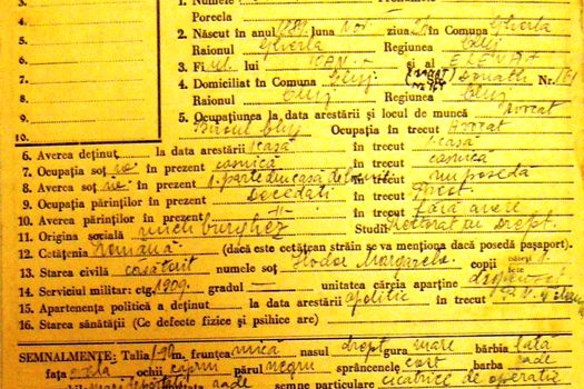 Se arăta că e încarcerat din 16 august 1952, ”în cadrul Ordinului nr. 490 Cabinet şi încadrat în C.M. pe timp de 60 de luni, în baza procesului-verbal nr. 12/1952, pedeapsa urmînd să expire la 16 aug. 1957” şi că, în conformitate cu ”Ordinul M.A.I. nr. 852/0074928 din 7 mai 1954, s-a dispus recercetarea lui de către M.A.I., Regiunea Cluj”, ocazie cu care s-a stabilit că a fost ”element activ” în 1946, în propaganda electorală împotriva Partidului Comunist, scriind în trecut şi materiale împotriva Uniunii Sovietice, iar ”pe baza acestor materiale, susnumitul a fost trimis de noi în judecată la Tribunalul Militar Teritorial Oradea, de unde, la data de 24 octombrie 1955, cu raportul nostru nr. 8/91.650, a fost înaintat M.A.I.-ului, conform ordinului verbal al tovarăşului locţiitor de ministru, gen.lt. Pintilie Gheorghe”.