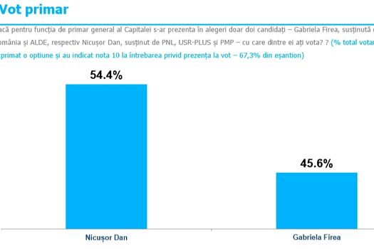 Participanţii la studiu au fost întrebaţi pe cine ar alege dacă pentru funcţia de primar al Capitalei s-ar prezenta în alegeri doar doi candidaţi, adversarii politici Nicuşor Dan şi Gabriela Firea. 54,4% au ales candidatul PNL, USR-PLUS şi PMP, iar 45,6% pe Gabriela Firea, susţinută de PSD, ALDE şi Pro România.