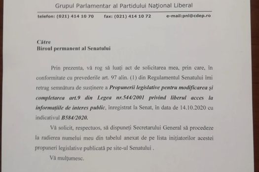 „Am depus azi o solicitare în scris de retragere a semnăturii de pe un proiect de lege iniţiat de o colegă deputat, care viza reglementări în cazul legii 544, privind liberul acces la informaţii de interes public. Am primit semnale de la oameni de bună credinţă, că în forma propusă de iniţiator poate naşte interpretări abuzive, şi din acest motiv nu am dorit să las nici un fel de interpretare”, afirmă Florin Roman.