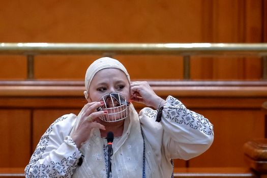 Prima pagină » Politic » FOTO Diana Şoşoacă a venit cu o botniţă la gură în Parlament