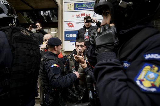 3 George Simion discuta cu jandarmeria dupa un incident desfasurat in cadrul marsului „Lupta pentru Basarabia”, in Bucuresti, sambata, 22 octombrie 2016. Peste 2.000 de oameni au participat, sambata, la Marsul pentru Basarabia organizat de Platforma Unionista, manifestantii cerandu-le presedintelui, premierului, dar si liderilor politici sa-si asume unirea Romaniei cu Basarabia ca proiect de tara. Cinci manifestanti care participau la mars au fost ridicati de politie. ALEXANDRU ANDREEA / MEDIAFAX FOTO