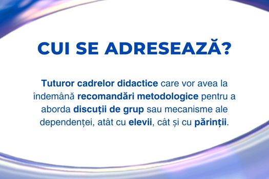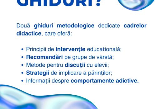 Primul ghid conţine principii de intervenţie educaţională şi recomandări metodologice adaptate pe grupe de vârstă, precum şi exemple de activităţi de prevenţie. Al doilea ghid este dedicat părinţilor, oferindu-le informaţii despre riscurile asociate consumului de droguri şi modalităţi de educaţie şi intervenţie eficientă în familie.