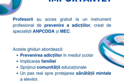 Pentru prima dată în România, cadrele didactice vor avea acces gratuit la ghiduri elaborate de specialişti ai ANPCDDA şi MEC, în colaborare cu societatea civilă. În ghiduri sunt „prezentate metode şi principii pe care cadrele didactice le vor putea aplica pentru a preveni consumul de substanţe sau alte comportamente adictive. De asemenea, materialele conţin şi o prezentare a unor metode eficiente prin care profesorii pot dezvolta, la nivelul familiei, abilităţi necesare prevenirii adicţiilor la adolescenţi.”