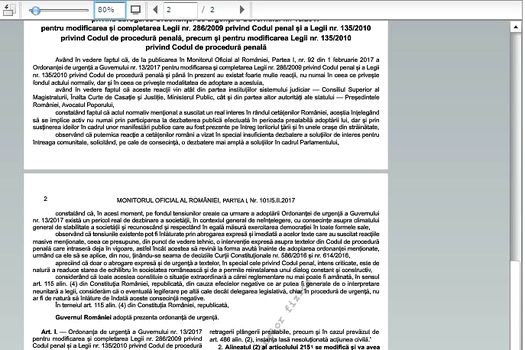 Executivul mai arată că adoptarea acestei ordoanţe este necesară ”având în vedere faptul că aceste reacţii vin atât din partea instituţiilor sistemului judiciar, CSM, ÎCCJ, Ministerul Public, cât şi din partea multor autorităţi ale statului, preşedintele României, Avocatul Poporului; constatând faptul că actul normativ menţiont a succitat un real interes în rândul cetăţenilor României, aceştia înţelegând să se implice activ nu numai prin participarea la dezbaterea publică efectuată în perioada prealabilă adoptării lui, dar şi prin susţinerea ideilor în cadrul unor manifestări publice care au fost prezente pe întreg teritoriul ţării şi în unele oraşe din străinătate; observând că puternica reacţie a cetăţenilor români a vizat în special insuficienta dezbatere a soluţiilor de interes pentru întreaga comunitate, solicitând pe cale de consecinţă o dezbatere mai amplă a soluţiilor în cadrul Parlamentului; constatând că în acest moment pe fondul tensiunilor create ca urmare a adoptării OUG 13/2017 există un pericol real de dezbinare a societăţii în contextul general de neînţelegeri cu consecinţe asupra climatului general de stabilitate a societăţii şi recunoscând şi respectând în egală măsură exercitarea democraţiei în toate formele sale; observând că tensiunile existente pot fi înlăturate prin abrogarea expresă şi imediată a acelor texte care au suscitat reacţiile masive menţionate, ceea ce presupune din punct de vedere tehnic o intervenţie expresă asupra textelor din Codul de procedură penală care intraseră deja în vigoare astfel încât acestea să revină la forma avută înainte de adoptarea ordonanţei menţionate, urmând ca ele să se aplice din nou ţinându-se seama de deciziile CCR nr. 586/2016 şi nr.614/2016; apreciind că doar o abrogare expresă şi de urgenţă a textelor, în special cele privind Codul penal intens criticate, este de natură a readuce starea de echilibru în societatea românească şi de a permite reinstalarea unui dialog constant şi constructiv; considerând că toate acestea constituie o situaţie extraordinară a cărei reglementare nu mai poate fi amânată în sensul art. 115 alin. 4 din Constituţia României republicată, din cauza efectelor negative ce ar putea fi generate de o interpretare neunitară a legii, considerăm că o eventuală legiferare pe altă cale decât delegarea legislativă, chiar în procedură de urgenţă, nu ar fi de natură să înlăture de îndată aceste consecinţe negative”.