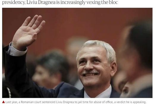 The Guardian aminteşte că anul trecut, liderul PSD a fost condamnat la trei ani şi jumătate în închisoare pentru abuz în serviciu într-un caz de corupţie. Jurnaliştii britanici menţionează de asemenea că acesta este anchetat şi pentru dosarul Tel Drum şi că, între timp, Guvernul încearcă să treacă o lege a amnistie care ar preveni închiderea lui Liviu Dragnea şi a multor altora.