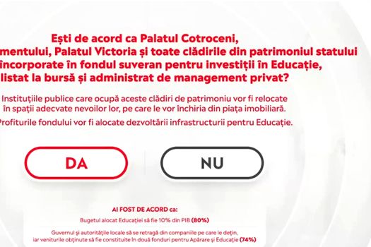 60% din respondenţii sondajului Mediafax-ZF- Aleph News, au fost de acord ca Palatul Cotroceni, Palatul Parlamentului, Palatul Victoria şi în general toate clădirile din patrimoniul statului să fie încorporate într-un fond suveran pentru investiţii în educaţie, listat la bursă şi administrat de management privat, iar 40% au respins această propunere.