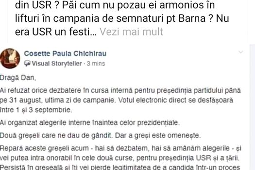 „Dragă Dan, Ai refuzat orice dezbatere în cursa internă pentru preşedinţia partidului până pe 31 august, ultima zi de campanie. Ai organizat alegerile interne înaintea celor prezidenţiale. Două greşeli care ne dau de gândit. Dar a greşi e omeneşte. Repară aceste greşeli acum – hai să dezbatem, hai să amânăm alegerile – şi vei putea intra onorabil în cele două curse, pentru preşedinţia USR şi a ţării. Persistă în greşeală şi îţi vei pierde legitimitatea de a candida într-un proces democratic, pentru că nu pare că susţii democraţia”, a scris Cosette Chichirău în postarea pe grupul intern al USR de Facebook.