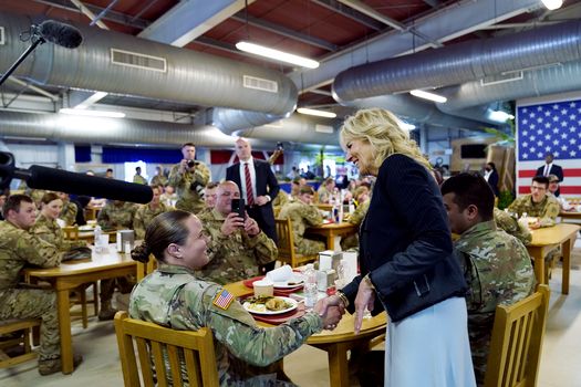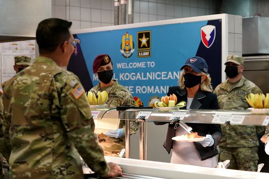 Jill Biden a vorbit cu militarii americani staţionaţi în Baza aeriană Mihail Kogălniceanu, în judeţul Constanţa, mulţumindu-le pentru activităţi.