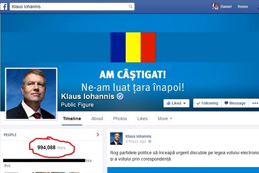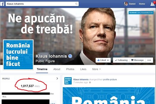 Pagina oficială de Facbook a lui Klaus Iohannis a depăşit, marţi, 1 milion de aprecieri, preşedintele PNL devenind primul în topul politicienilor la numărul de aprecieri primite. Cea mai mare creştere a numărului de fani ai paginii lui Iohannis a avut loc sâmbătă, potrivit Facebrands.ro, în ajunul alegerilor prezidenţiale, când baza de simpatizanţi a crescut cu peste 185.000, la 848.419, depăşindu-l pe contracandidatul său la Preşedinţie Victor Ponta.