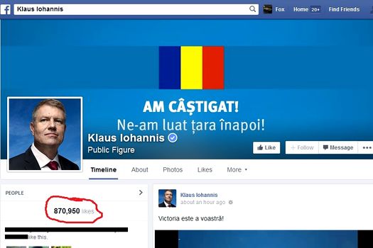 Cu peste 1.043.000 de fani pe Facebook, Klaus Iohannis este urmat, în topul politicienilor români, de Victor Ponta (718.584 de fani), Traian Băsescu (321.541) şi Elena Udrea (266.565).