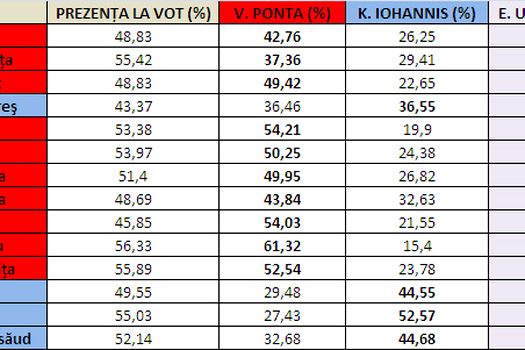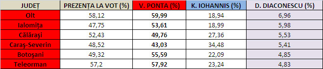 Datele au fost preluate din raportările oficiale făcute de BEC şi Birourile Electorale Judeţene. Până la ora publicării acestui articol, statisticile pentru judeţul Ilfov nu au fost făcute publice.