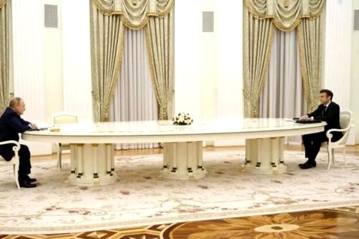 Preşedintele francez a încercat în februarie 2022 să-l prevină pe Putin să invadeze Ucraina, dar fără succes, iar din urma acestor negocieri n-au rămas decât imaginile ironizate de opinia publică, în care cei doi omologi discută la distanţă, la o masa lungă.