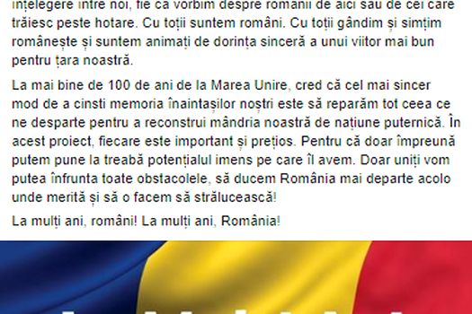 ”Ziua Naţională este cel mai bun moment în care putem vorbi despre unitatea tuturor românilor. Despre solidaritate. Şi despre o mai bună înţelegere între noi, fie că vorbim despre românii de aici sau de cei care trăiesc peste hotare. Cu toţii suntem români. Cu toţii gândim şi simţim româneşte şi suntem animaţi de dorinţa sinceră a unui viitor mai bun pentru ţara noastră. La mai bine de 100 de ani de la Marea Unire, cred că cel mai sincer mod de a cinsti memoria înaintaşilor noştri este să reparăm tot ceea ce ne desparte pentru a reconstrui mândria noastră de naţiune puternică”, a scris pe Facebook Marcel Ciolacu.