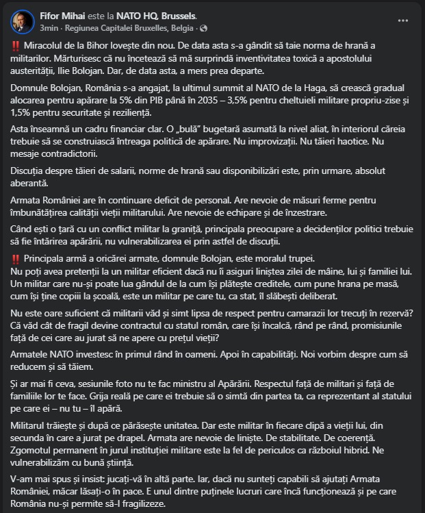 Mesajul include și o componentă politică explicită. Mihai Fifor îl acuză pe Ilie Bolojan de „inventivitate toxică” și susține că „sesiunile foto nu te fac ministru al Apărării”, sugerând că respectul și grija față de militari ar trebui să fie prioritare.