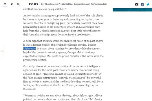 Ziarul New York Times relatează despre acuzaţiile formulate în timpul campaniei pentru prezidenţiale de către Traian Băsescu la adresa lui Victor Ponta privind statutul acestuia de fost ofiţer al SIE, într-un articol în care se vorbeşte şi despre Robert Turcescu, Elena Udrea şi Teodor Meleşcanu.
