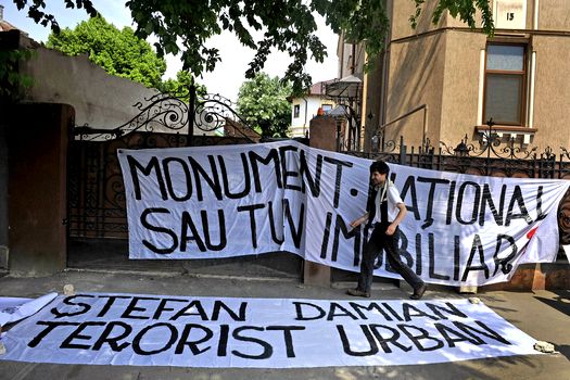 2. Nicusor Dan, presedintele Asociatiei „Salvati Bucurestiul”, trece prin fata unor bannere amplasate in fata unui imobil de pe Strada Icoanei, in cadrul unui protest, la Bucuresti, luni, 18 mai 2009. Asociatia Salvati Bucurestiul a organizat un pichet de protest in fata cladirii din str. Icoanei nr. 13, cerand autoritatilor salvarea acesteia de la demolare. RAZVAN CHIRITA / MEDIAFAX FOTO