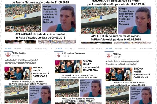 În partea inferioară a colajului, o altă fotografie a Simonei Halep, în care ridică premiul de la Roland Garros, este alăturată unei imagini de la mitingul PSD de sâmbătă, din Piaţa Victoriei.