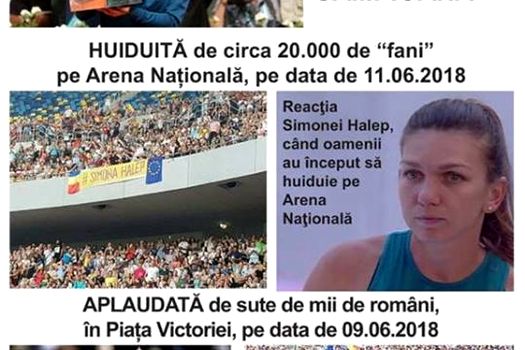 În colaj apar mai multe fotografii cu Simona Halep, însoţite de textele ”Simona Halep, marea noastră campioană, a fost huiduită de 20.000 de