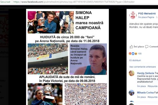 Într-o fotografie, câştigătoarea turneului Roland Garros, Simona Halep, apare într-o ipostază nedumirită, iar legenda pozei este ”Reacţia Simonei Halep când oamenii au început să huiduie pe Arena Naţională”.