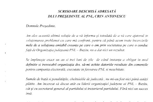 Potrivit unei scrisori deschise adresată preşedintelui PNL Crin Antonescu şi intrată în posesia MEDIAFAX, unul dintre asociaţii firmei Sistelse Impex, Silviu Mureşan, îi scrie liderului liberal, cerându-i ajutorul pentru soluţionarea pe cale amiabilă a recuperării unei creanţe de peste 90.000 de lei de la PNL Buzău.
