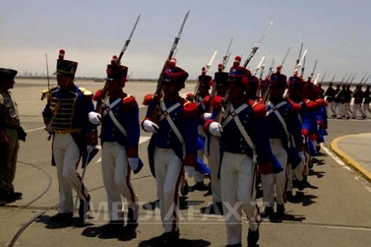 Băsescu a fost întâmpinat la coborârea din avion de ministrul Apărării de la Lima, alături de aproximativ 150 de soldaţi din Garda peruană de Onoare, în timpul ceremoniei fiind trase şi mai multe salve de tun.