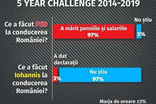 „5 Year Challenge 2014-2019. Ce a făcut PSD la conducerea României? A mărit pensiile şi salariile – 97%, Nu ştiu – 3%. Ce a făcut Iohannis la conducerea României? A dat declaraţii – 3%. Nu ştiu – 97%. Marjă de eroare +/- 3%”, arată social-democraţii, duminică pe Facebook, imaginea fiind însoţită de mesajul „No comment”.