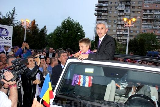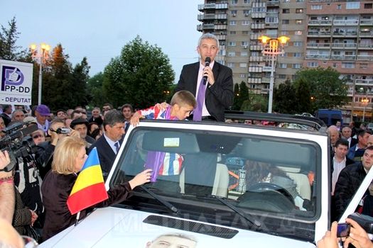 Susţinătorii l-au aşteptat pe Diaconescu într-un decor alb-violet, care i-a derutat pe trecători, mulţi gândindu-se că în sala de sporturi este prezentă echipa Poli Timişoara.