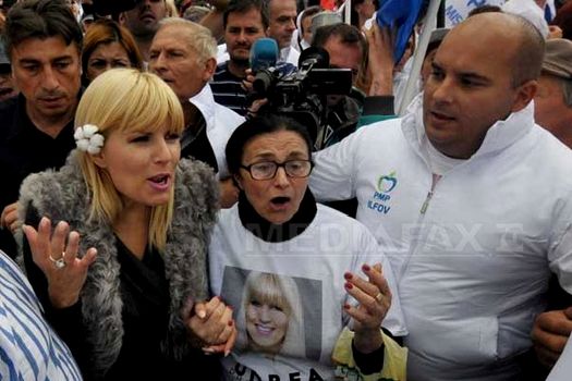 Pe drumul spre Piaţa Victoriei, Elena Udrea a suflat din când în când dintr-un fluier verde, în timp ce participanţii au scandat „Viorel să ţii minte, Elena e preşedinte”, „Victor Ponta ca să ştii, Udrea te va ciurui” sau „PMP şi PNŢCD, o mare victorie”.