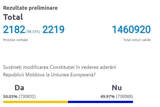 Cei care au votat „Da” pentru aderarea Republicii Moldova la UE au un avans în faţa celor care s-au opus. Potrivit rezultatelor afişate şi actualizate în timp real de către CEC, 50,03% dintre alegători au votat „Da” (730.832 de voturi), în timp ce 49,97% au votat „Nu” (730.021 de voturi).
