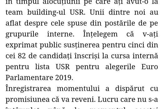 „Unii dintre noi au fost prezenţi la Barcelona în timpul alocuţiunii pe care aţi avut-o la un team building al USR. Unii dintre noi au aflat despre cele spune din postările de pe grupurile interne. Înţelegem că v-aţi exprimat public susţinerea pentru cinci din cei 82 de candidaţi înscrişi la cursa internă pentru lista USR pentru alegerilor europarlamentare din 2019. Înregistrarea momentului a dispărut cu promisiunea că va reveni. Lucru care nu s-a întâmplat până la momentul acestei postări. Ar fi utilă în formularea acestei scrisori, pentru a putea da citate cu exactitate. Încă credem că transparenţa este un principiu de bază în USR şi ne aşteptăm ca înregistrarea, ne-editată, să fie pusă la dispoziţie”, precizează semnatarii scrisorii deschise, potrivit documentului obţinut de MEDIAFAX.