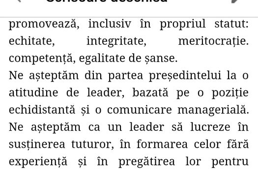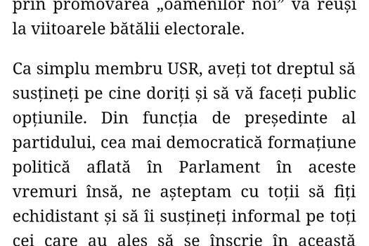 „Ca simplu membru USR, aveţi tot dreptul să susţineţi pe cine doriţi şi să vă faceţi public opţiunile. Din funcţia de preşedinte al partidului, cea mai democratică formaţiunea politică aflată în Parlament în aceste vremuri însă, ne aşteptăm cu toţii să fiţi echidistant şi să îi susţineţi informal pe toţi cei care au ales să se înscrie în această competiţie. Susţinerea publică pe care o acordaţi unor candidaţi este în dezacord cu principiile pe care USR le promovează, inclusiv în propriul statut: echitate, integritate, meritocraţie, competenţă, egalitate de şanse. Ne aşteptam din parte preşedintelui la o atitudine de leader bazată pe o poziţie echidistanţă şi o comunicare managerială. Ne aşteptam ca un leader să lucreze în susţinerea tuturor, în formarea celor fără experienţă şi în pregătirea lor pentru viitorul apropiat. Sunteţi preşedinte pentru toată suflarea useristă, nu doar pentru unii!”, au conchis membrii USR în documentul transmis lui Dan Barna.