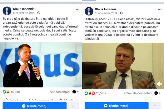 Eu cred că o dezbatere între candidaţi poate fi organizată oriunde este o platformă publică, independentă, accesibilă celor doi candidaţi şi întregii media. Orice se poate negocia dacă sunt satisfăcute aceste condiţii. O să rog echipa mea să continue negocierile”, scria în noiembrie 2014, pe Facebook, Klaus Iohannis.