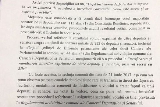 Cu toate acestea, arată sesizarea, ”la şedinţa comună din 21 iunie 2017, aşa cum s-a putut observa pe toate canalele de televiziune care au transmis în direct desfăşurarea lucrărilor, modalitatea concretă de desfăşurare a votului a arătat faptul că unii deputaţi şi senatori au votat la vedere, ceea ce pune sub semnul întrebării respectarea procedurii referitoare la asigurarea secretului votului cu bile prevăzută de Regulamentul activitărilor comune ale Camerei Deputaţilor şi Senatului”.